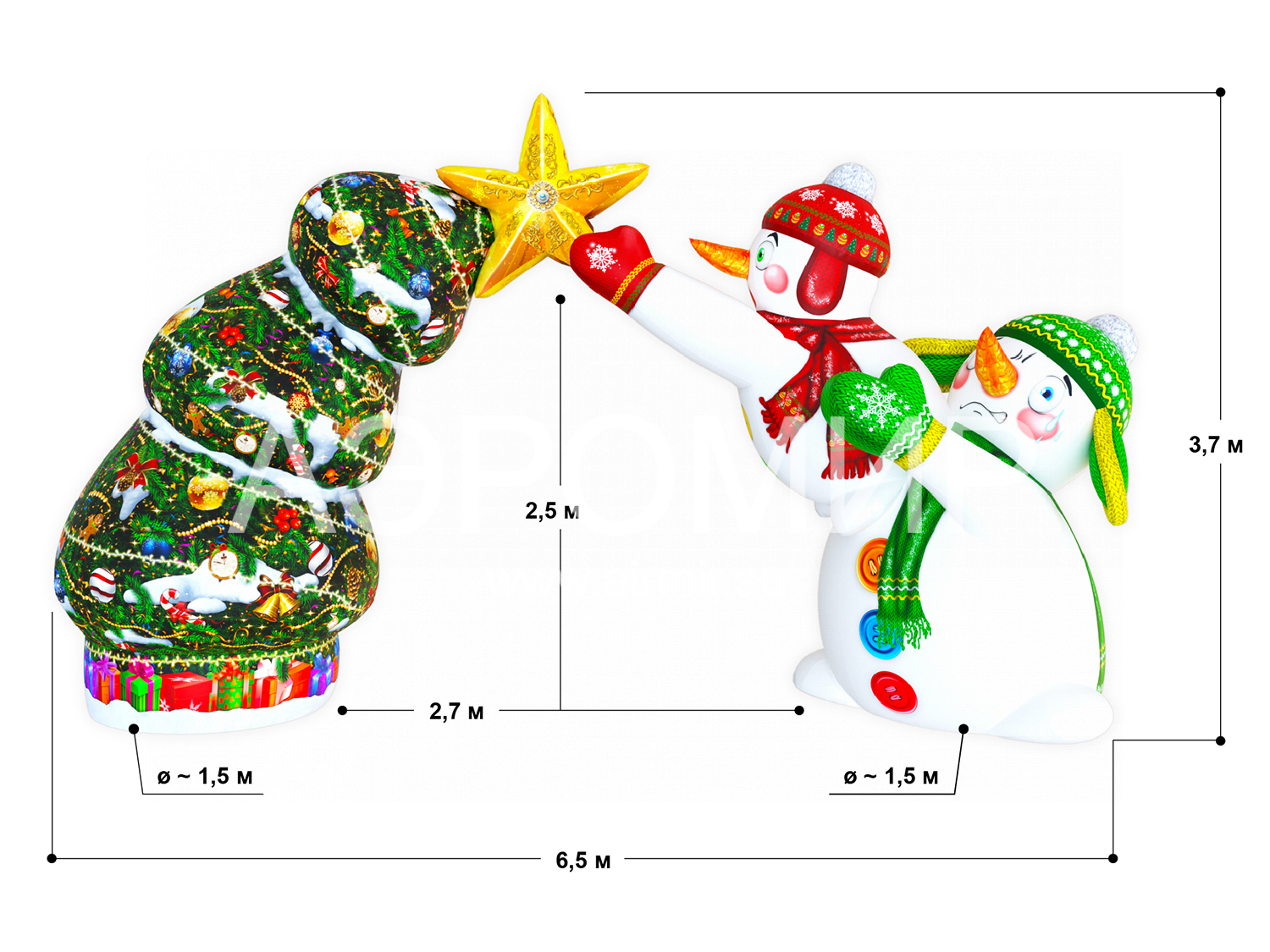 Арка «Новогодний переполох» – это эффектное украшение и оригинальная рекламная площадка! Надувная конструкция с милыми снеговиками, наряжающими елку, создает праздничное настроение. Объемная композиция прекрасно смотрится днем и волшебно светится ночью. Закажите брендирование и получите уникальную фотозону! Идеально подходит для оформления входа в парки, ледовые городки и торговые центры.