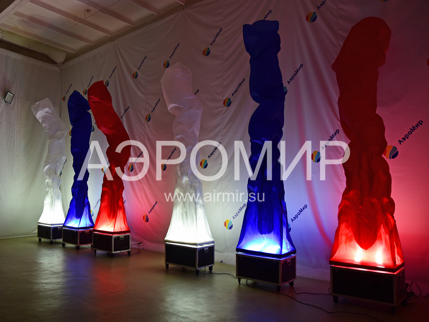 Аэрофонтан – это пример динамичного, а значит нескучного оформления праздничной площадки. Если Вы не представляете, что это такое, вспомните любой из увиденных когда-либо фонтанов. Как известно, он образуется, когда вода встречается с препятствием и из-за давления, создаваемого искусственно или естественно, устремляется вверх. Если заменить воду воздухом и ограничить его поток «трубой» из синтетической ткани, получится фонтан воздушный. Благодаря тому, что используемый материал, как правило, имеет очень гладкую, блестящую поверхность, на струящейся оболочке возникают переливы и блики, как на воде. Этот эффект заметно усиливается в вечернее время, когда можно включить встроенную подсветку.