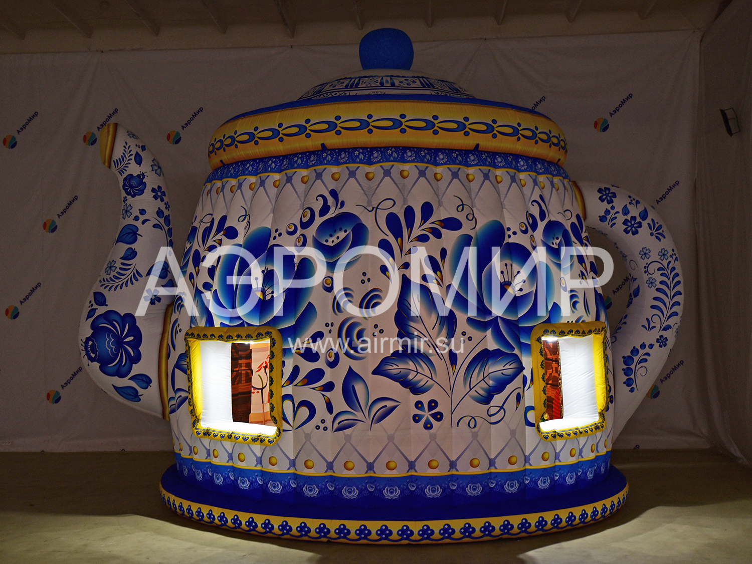Огромный надувной дом в виде чайника, роспись традиционными русско-народными узорами. Снаружи и внутри фотопечать, есть несколько готовых вариантов росписи. Может использоваться как фотозона, место проведения мастер-классов, выставок, ярмарок. Гарантия 1 год, доставка в любую точку.